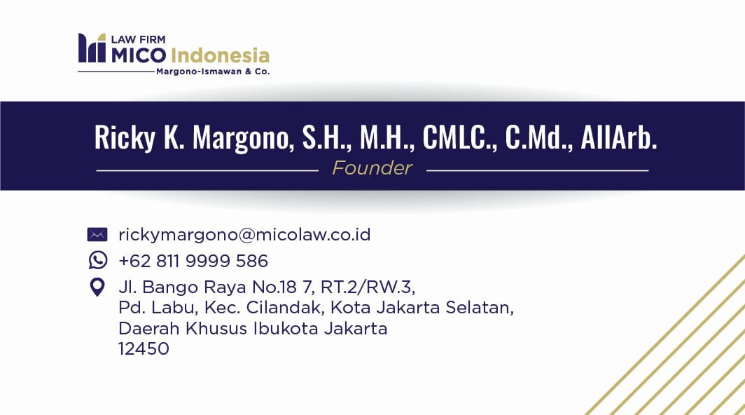 Ricky K. Margono, S.H., M.H., CMLC., C.Md., AIIArb has been active in the legal field for more than fifteen (15) years, with extensive experience as an Advocate, Receiver, Mining Legal Consultant, Mediator, and Arbitrator.
